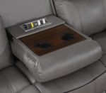 Gray Gel Leather, & Manual Motion Recliners, Pillow Top Arms and Headrest, & Cup Holder Console with Storage, Sinuous Spring Support System, Reenforced Steel Reclining Mechanism, Power Outlets, & USB Ports, Drop Down Cup Holder, & Hidden Storage Compartment in Sofa, Gray Gel Leather, Manual Motion Recliner, Pillow Top Arms and Headrest, Sinuous Spring Support System, Reenforced Steel Recliner Mechanism, Backs Detach for Easy Delivery