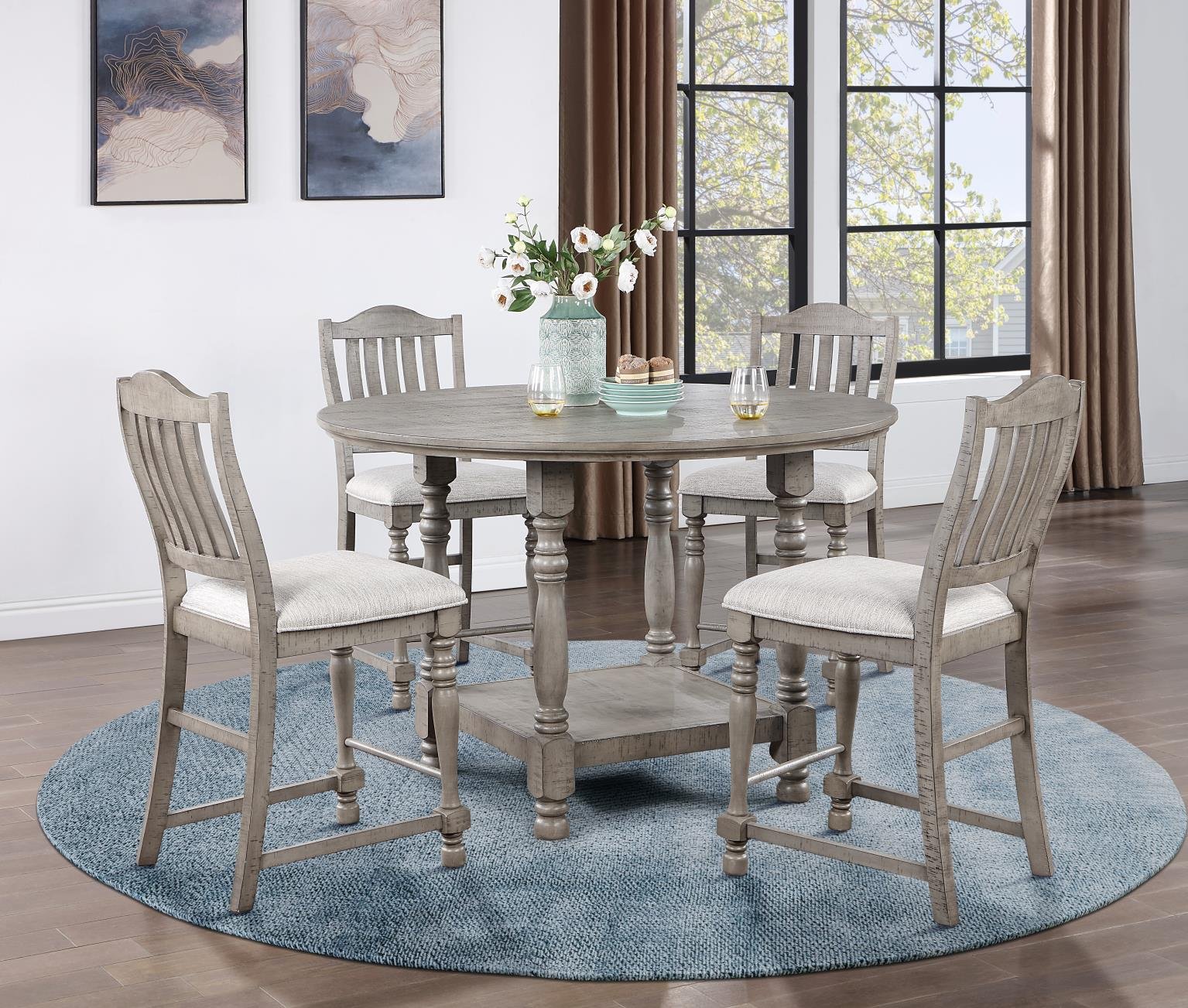 This light gray finish dining set features a 100% solid wood table with twisted legs and beige tightly woven seat cushions. Seats up to 4, making it ideal for cozy dining spaces.