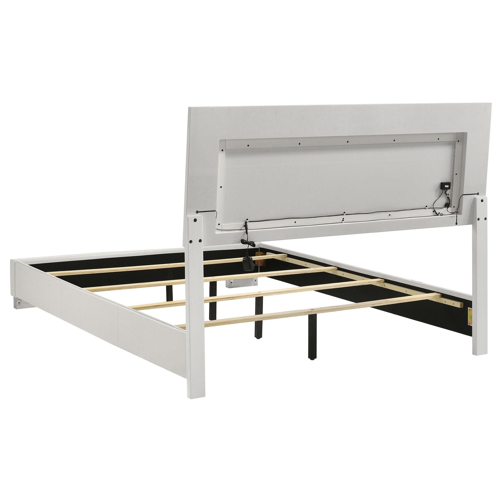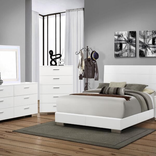define this contemporary bedroom set. The bed showcases a white high gloss