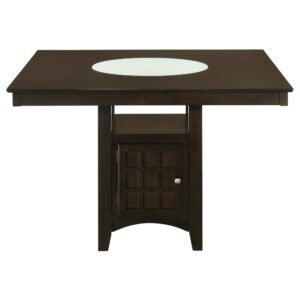 rich cappuccino finish, the set centers on a square dining table with an