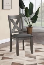 This gray birch veneer dining set includes a table with parallel wood grain finish and 6 side chairs with tightly woven gray fabric seating and X-style backs. Ideal for modern or rustic interiors.