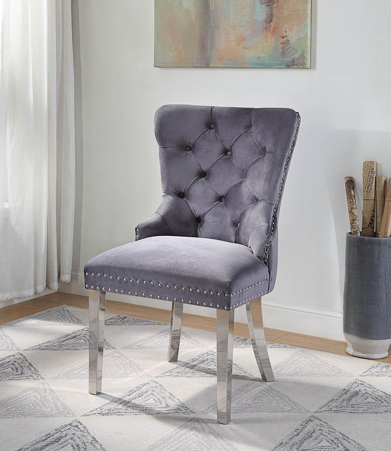 This dark gray velvet dining side chair offers luxurious velvet upholstery, stainless steel legs, nickel handles, nailhead trim, and button tufting. Sold in sets of 2. Ideal for contemporary interiors.