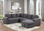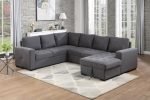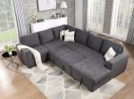 Gray Tightly Woven Chenille Fabric, Squared Arm Design, & Attached seat Cushions, Removeable Back Pillows, USB Charging Ports, & Black Plastic Legs, Hidden Chaise Storage, Hidden Pop-Up Sleeper