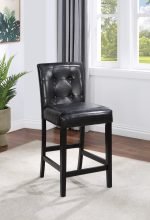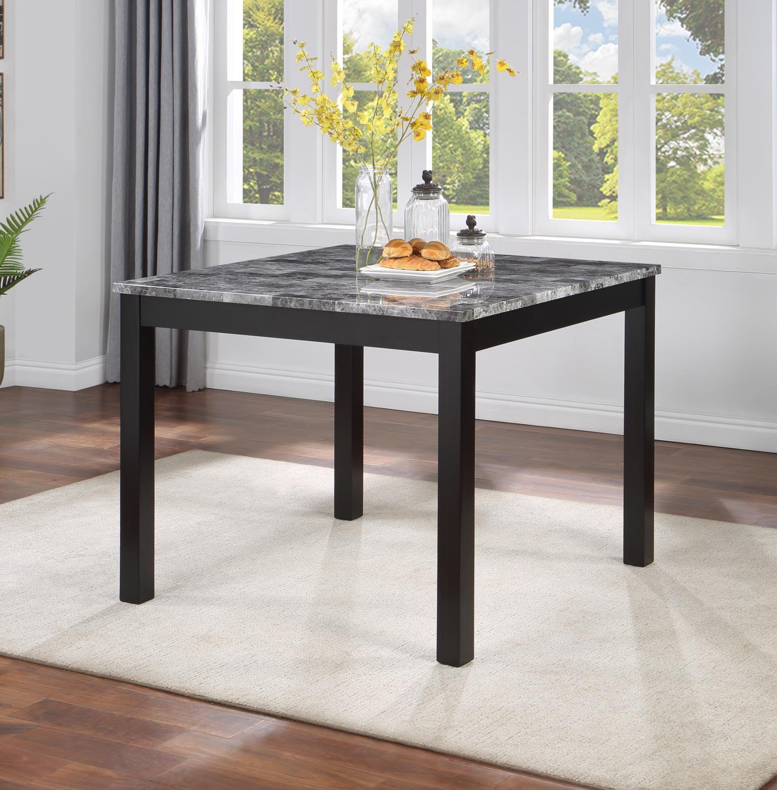 This gray/black counter table set includes a faux marble top, ebony black birch veneer legs, and 4 chairs with black faux leather cushions and button tufting. Perfect for modern kitchens.