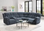 Transform your living space with the Rachel 3-Piece Sectional in stylish denim blue fabric. This durable sectional features reinforced steel construction with smooth manual reclining via convenient side pull tabs. Enjoy ultimate comfort with plush pillowtop arms and headrests, while two stainless steel cup holders and a spacious storage compartment keep essentials within reach. Perfect for family movie nights or entertaining guests.