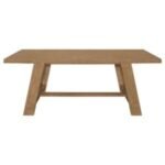 and wide trestle base add a distinctive modern touch to the classic farmhouse