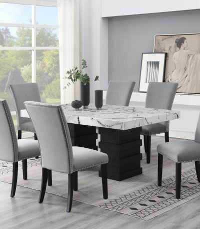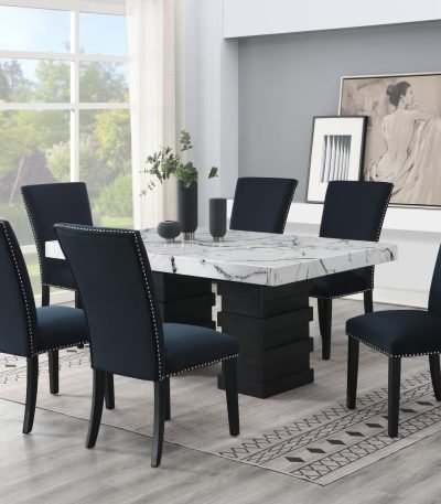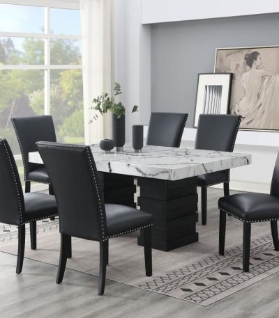 $1,189.95Standard Height White Faux Marble Top, Ebony Black 100% Hardwood Table Base, Horizontal Designed Base, Capable to Fit up to Six Chairs, White Tabletop Swirl Accents, Coordinates with Multiple Color Standard Height Chairs